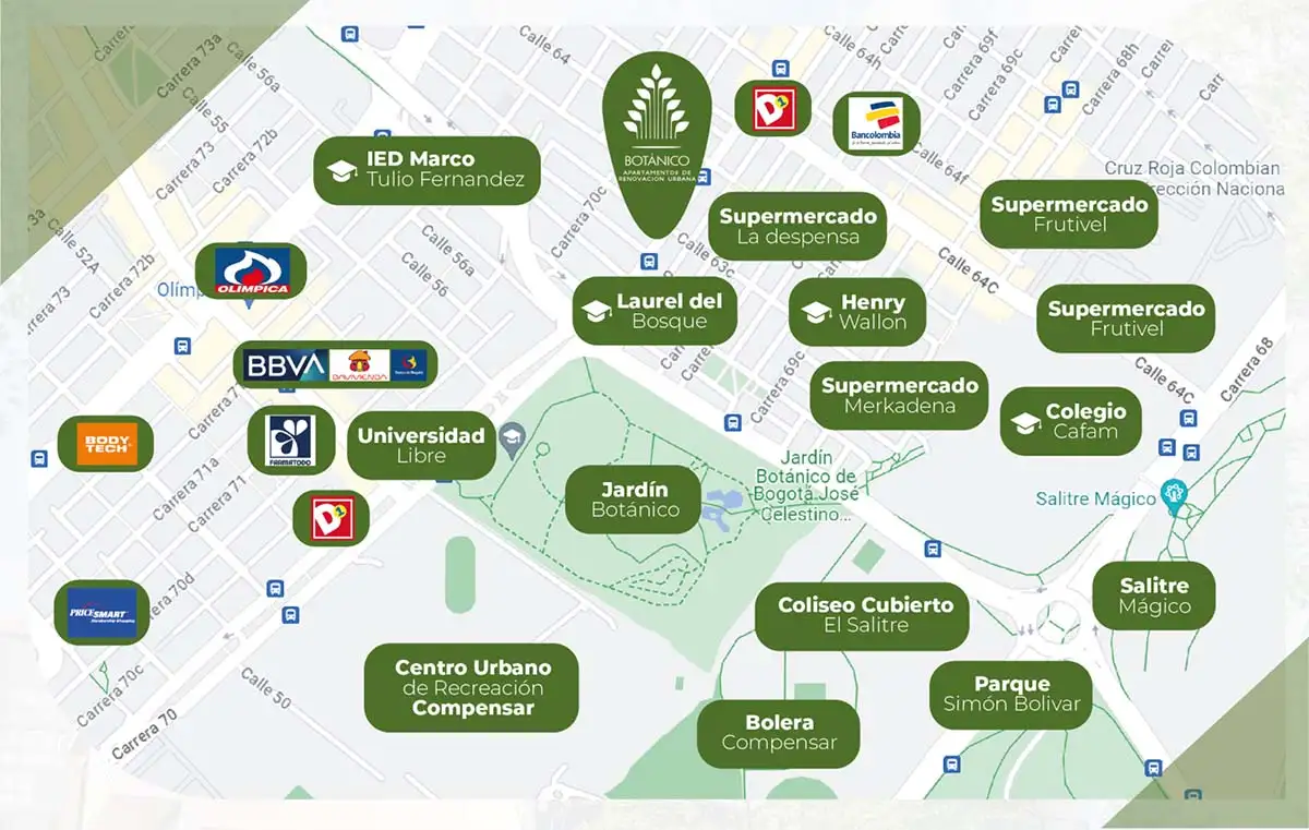 Our VIS Urban Renewal Project, Botánico, is located in Barrios Unidos, the 12th locality of Bogotá.It stands out for its commercial development, cultural offerings, and entertainment options, raising family living standards thanks to the wide variety of amenities and services available in its surroundings.
